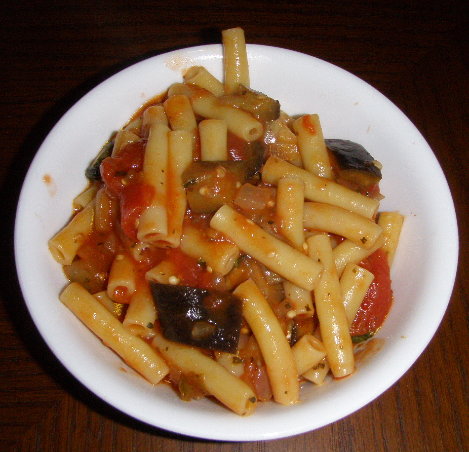 While the sauce is cooking, boil the ziti according to package directions, about 10 minutes. Drain, and toss in a dash of olive oil. Stir the eggplant and basil into the tomato sauce. Add the ziti and mix well. Serve right away and enjoy!