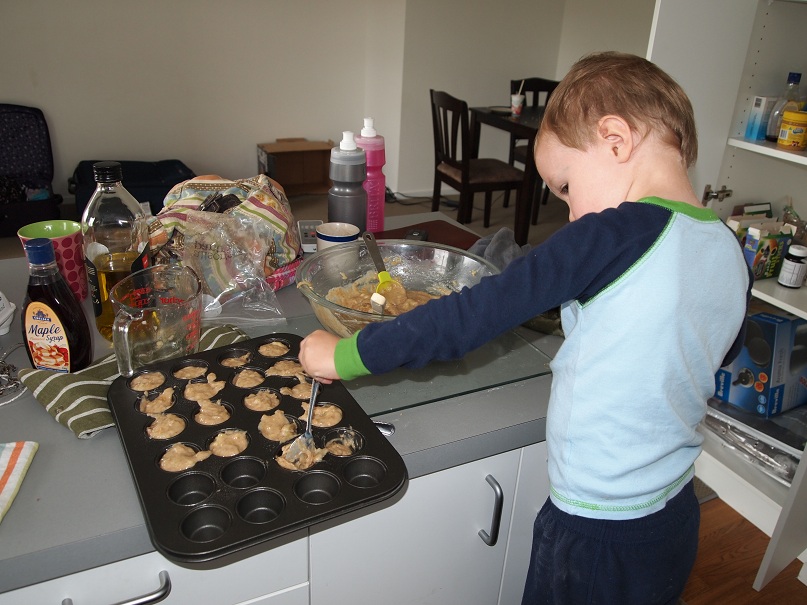 | my little boy loves to help in the kitchen. especially (only?) if I'm baking! turns out, it's challenging making banana muffins with a little monkey nearby- he ate half of the first banana. |