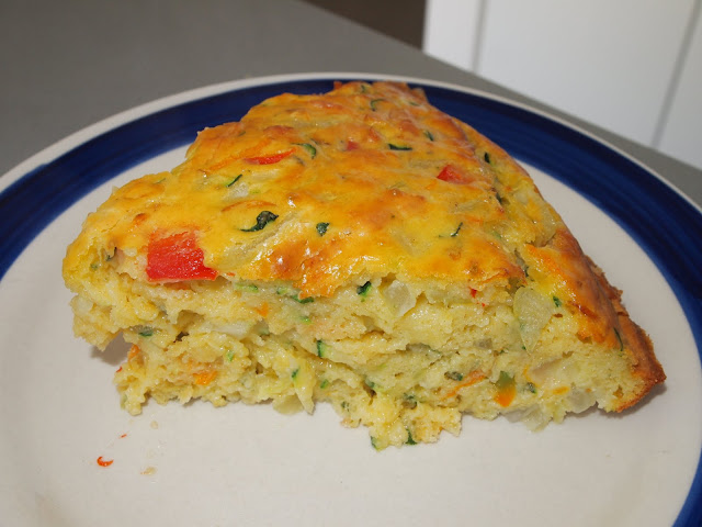 Pour into a greased pie plate and bake for 30-40 minutes or until golden brown on top, and set in the middle. Allow to cool for 10 minutes before cutting.
