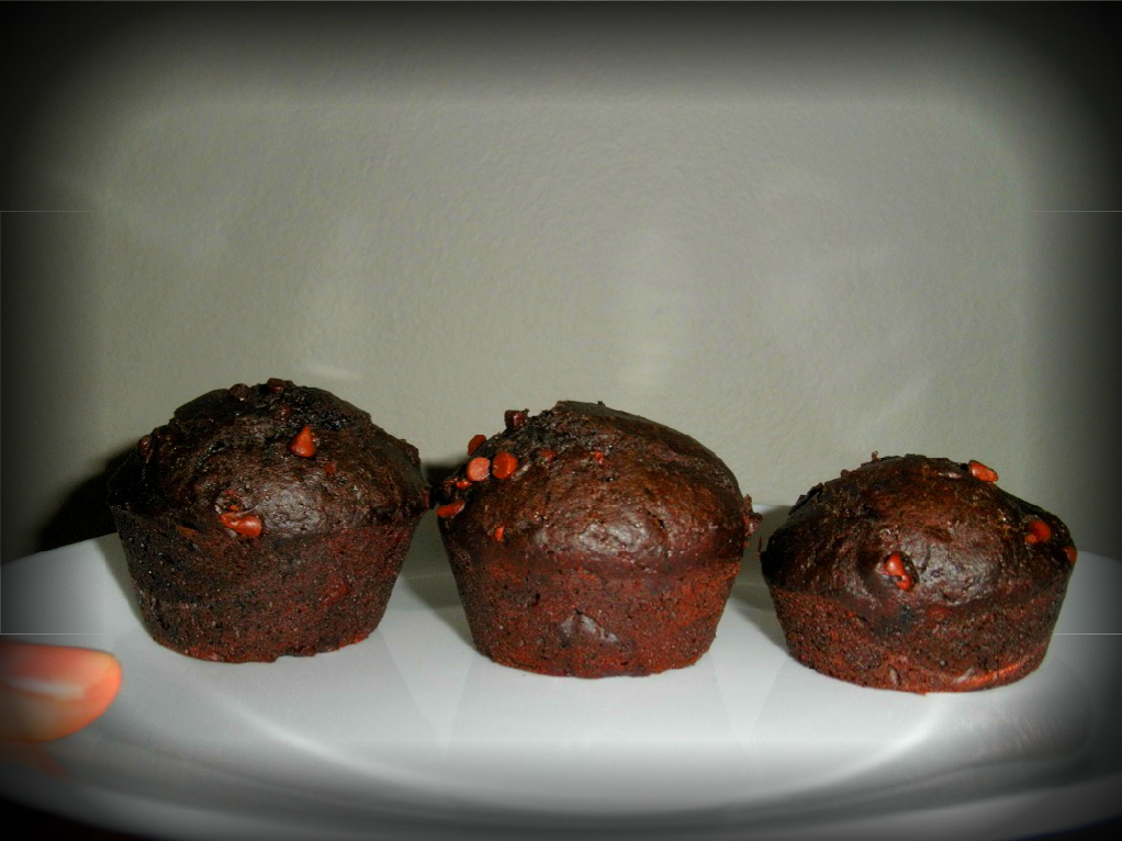 Mix dry ingredients. Add oil, vinegar and water. Mix well. Add chocolate chips and blend. Scoop into greased muffin tin and bake at 350F (180C) for 20-30 minutes, or until a toothpick comes out relatively clean. Cool for as long as possible, then enjoy!